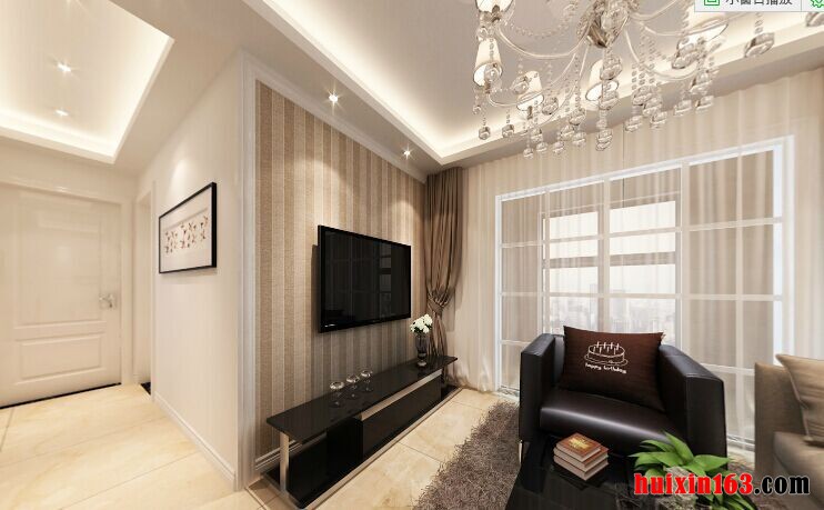 本案例的装修设计有着一种时尚、温馨的感觉,在客厅的装饰布置当中,所占据的空间面积并不是很大,但却显得比较新颖别致,通过设计师独具匠心的设计,房间整体效果都展现出一种舒适的感觉,平顶式的石膏板吊顶,搭配上一盏亮丽的水晶吊灯,让空间的采光更加的明亮透彻,亮丽的地砖与吊顶上下相互呼应,沙发背景墙是照片墙的设计,在装饰空间的同时,也是对一些美好事物的记忆与留恋,纯白色布艺的沙发添加,色泽不一的抱枕装饰,让空间的色彩不显得单调,同时通过这些过渡色彩的铺垫,让空间显得更加的可爱动人,从侧面也展现出一种梦幻的感觉。