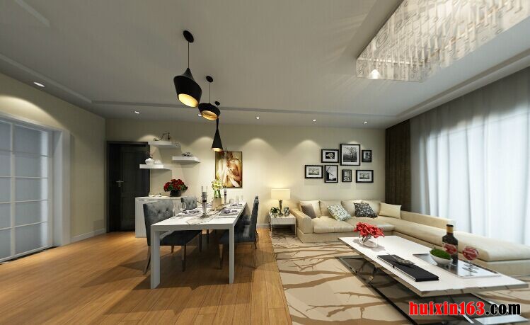 85平米的二居室,采用现代简约的装修风格,整个空间大量的留白处理,营造一个轻松惬意的居室环境,客厅采用平顶式的石膏板吊顶,搭配上一盏亮丽的水晶吊灯,让空间显得比较舒适雅致,落地装的设计搭配上轻质的窗帘让空间的采光更加的明亮透彻,在视觉感观上也展现出一种朦胧美感,实木铺设的地板,浅黄色的色彩为空间铺设一层温馨的氛围,开放式的餐厅设计,也让空间显得比较宽阔敞亮,餐厅的吊顶造型比较个性,而且餐桌的餐具摆放以及色彩搭配也不失时尚与浪漫,高脚红酒杯的添加,在这个优雅的环境当中也能轻松的营造出甜蜜的二人世界。